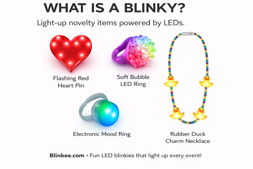 A blinky is a small flashing or light-up novelty item, typically powered by LEDs, used for parties, events, promotions, and fun visual effects.