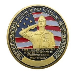 Gold Plated Veterans Tribute Challenge Coin Saluting Soldier and USA Flag Design