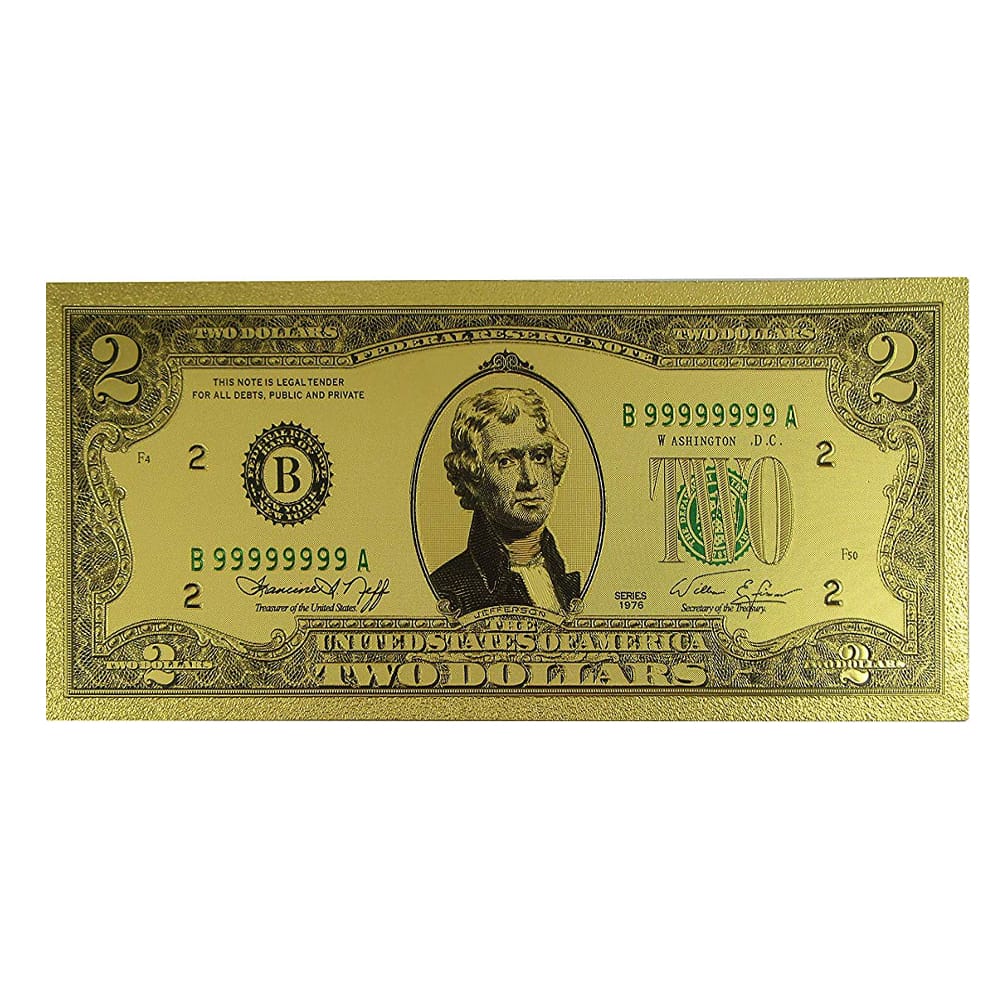 This extravagant 24k gold plated imitation bank note is a one of a kind commemorative item. Our 2 Dollar Commemorative Collectible Premium Replica Paper Money Bill 24k Gold Plated Fake Currency Banknote Art Holiday Decoration is handcrafted with utmost care to each element which recreates the actual United States one dollar bill.