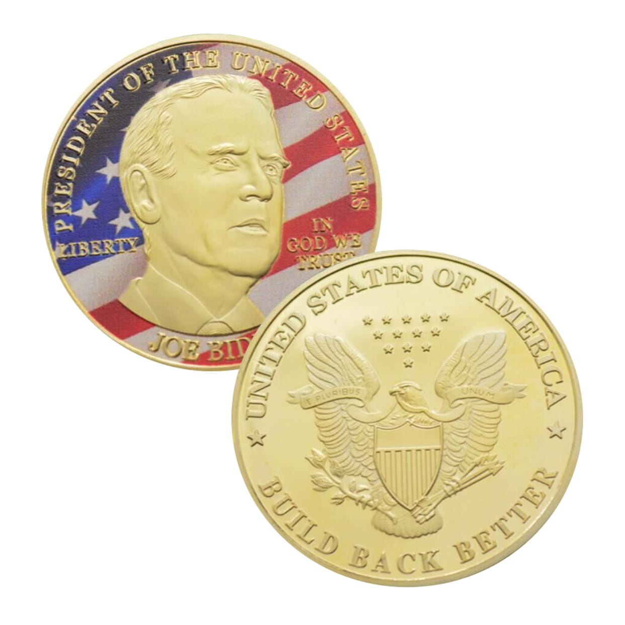 Features: The obverse bears the President Biden with the American flag superimposed, Front: President of the United States. Back: “United States of America. Build Back Better”. The other side is a gold coated bald eagle with the national shield.