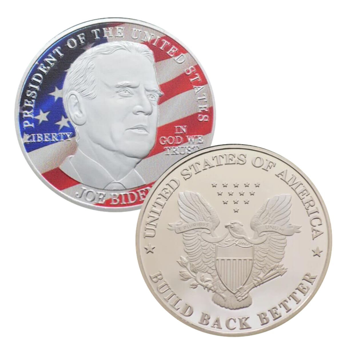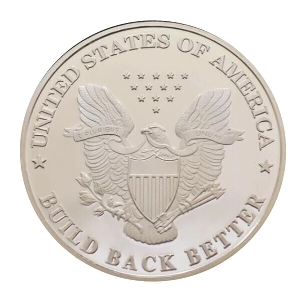 Features: The obverse bears the President Biden with the American flag superimposed, Front: President of the United States. Back: “United States of America. Build Back Better”. The other side is a silver coated bald eagle with the national shield.