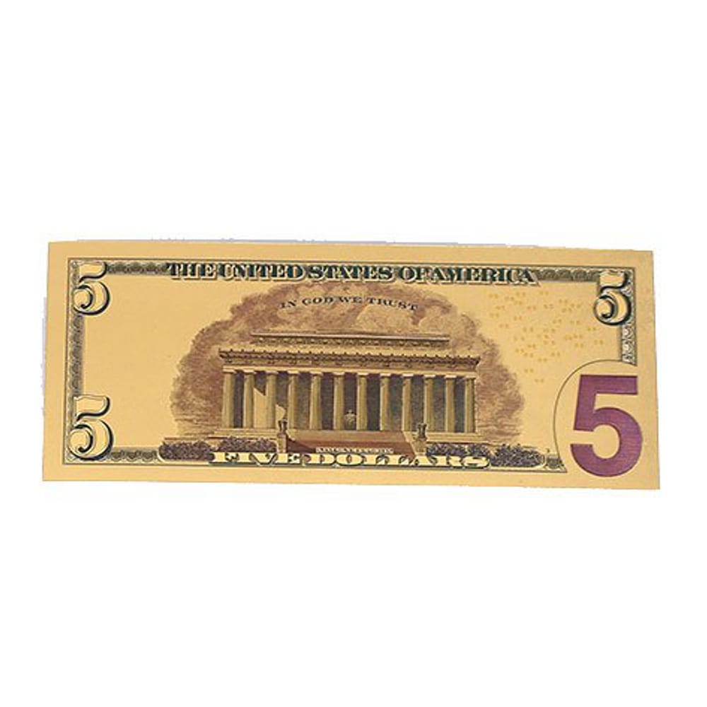 This extravagant 24k gold plated imitation bank note is a one of a kind commemorative item. Our 5 Dollar Commemorative Collectible Premium Replica Paper Money Bill 24k Gold Plated Fake Currency Banknote Art Holiday Decoration is handcrafted with utmost care to each element which recreates the actual United States five dollar bill.