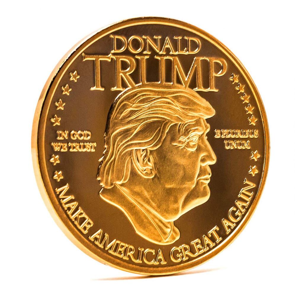 Make America Great Again! This Golden coin features President Trump and his iconic signature on one side and his bust on the other. Show your support for a great America with this commemorative coin.