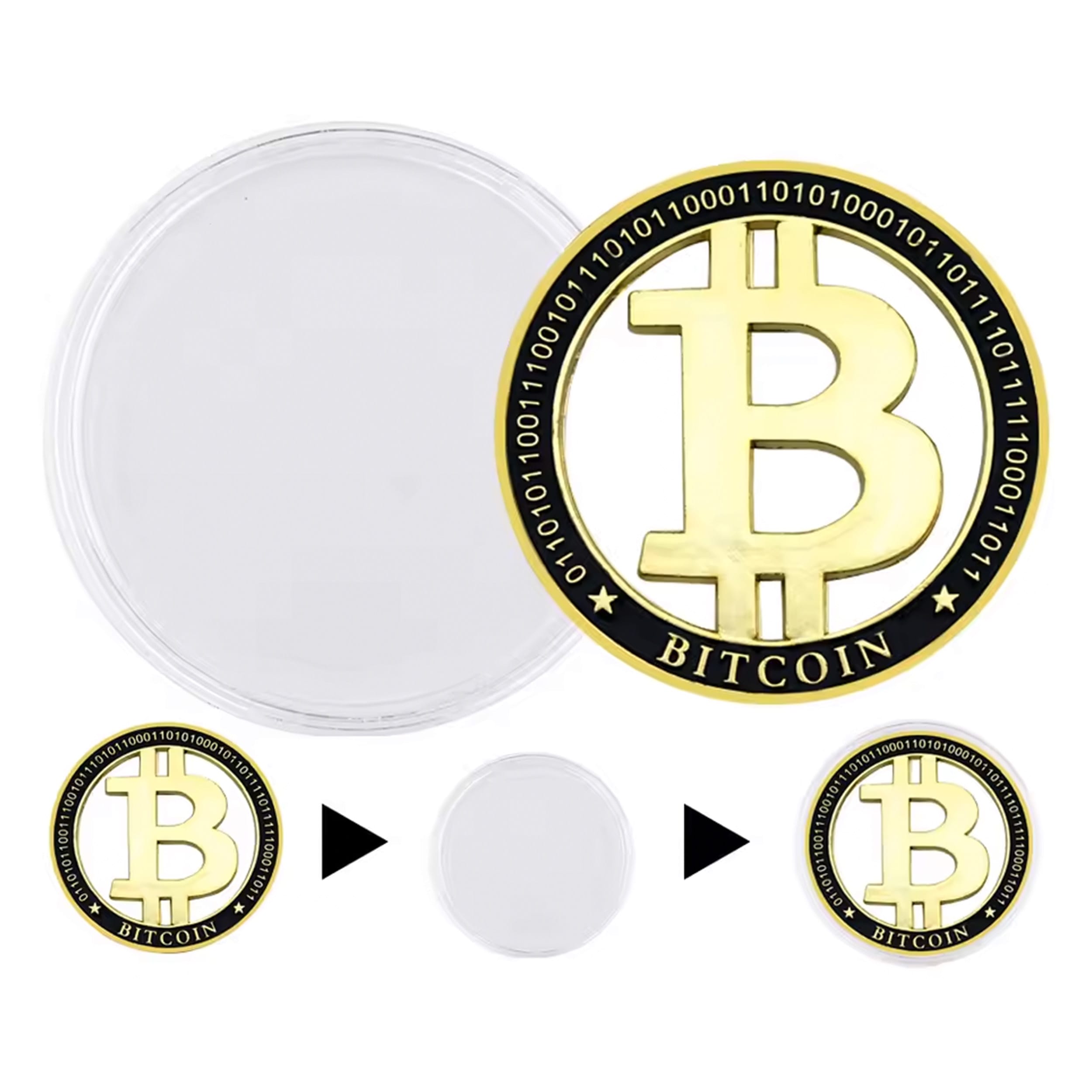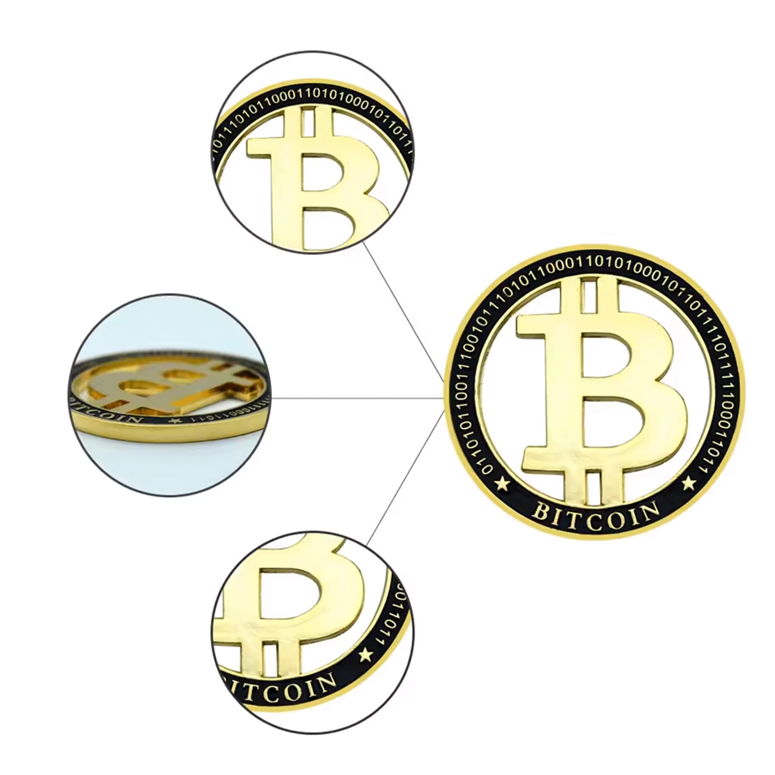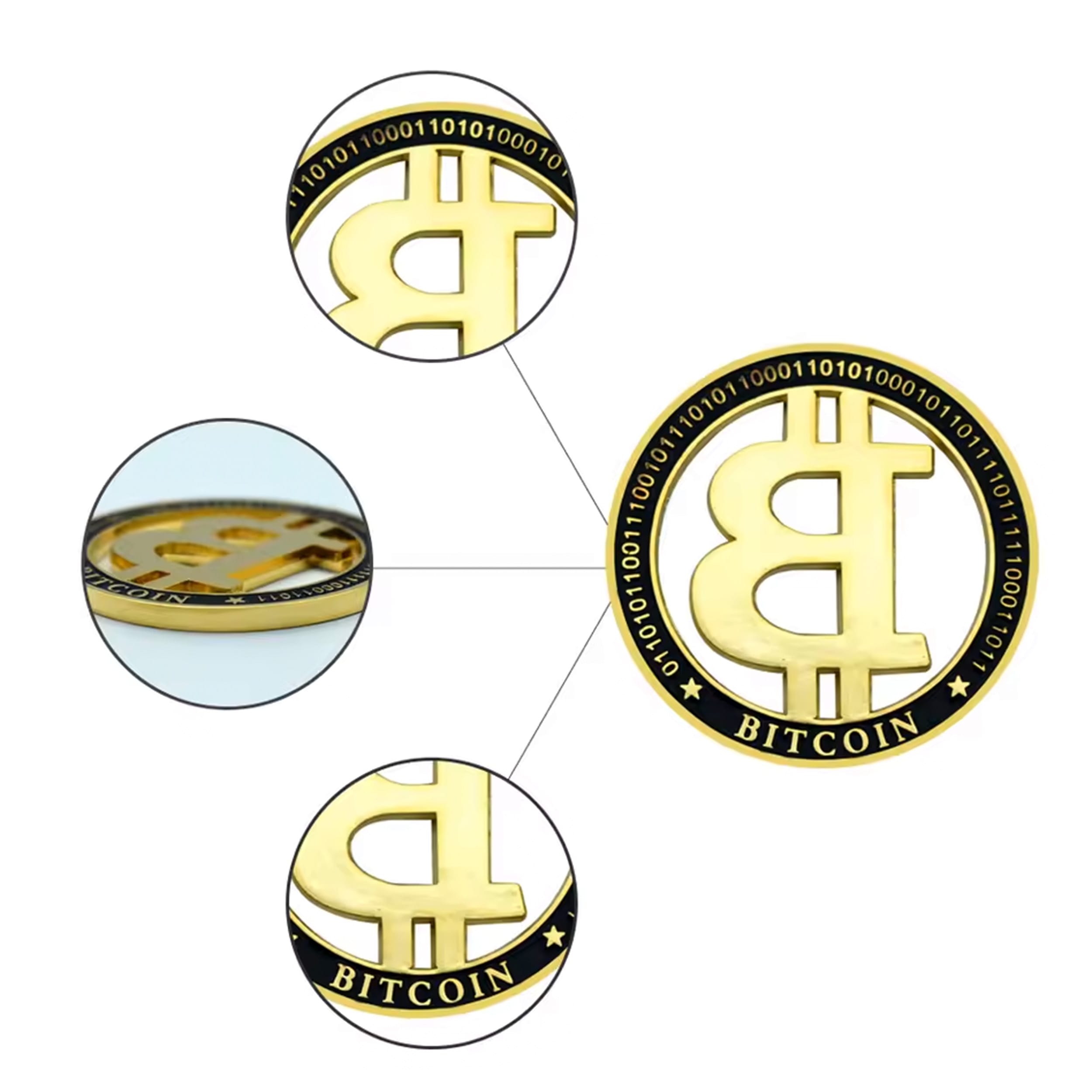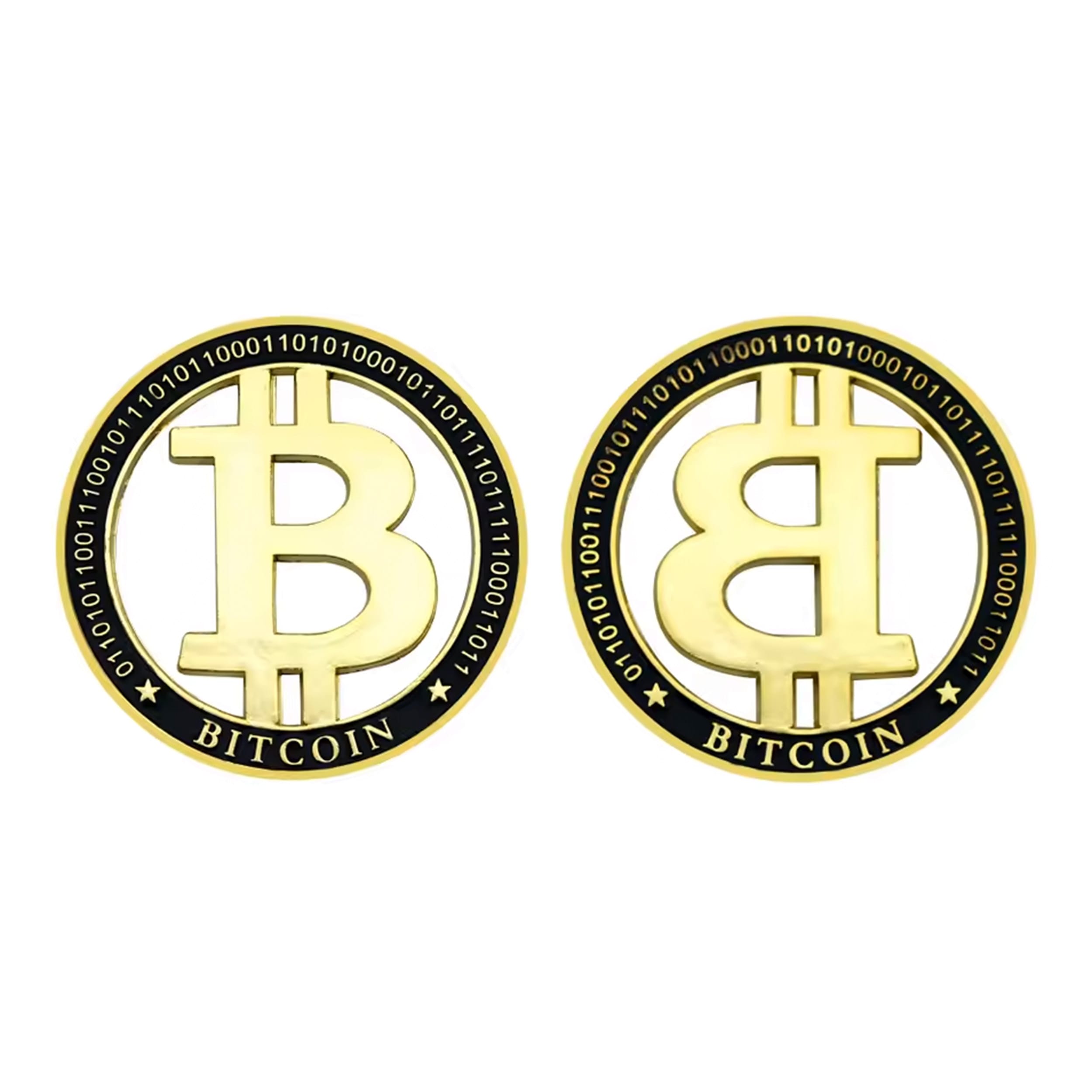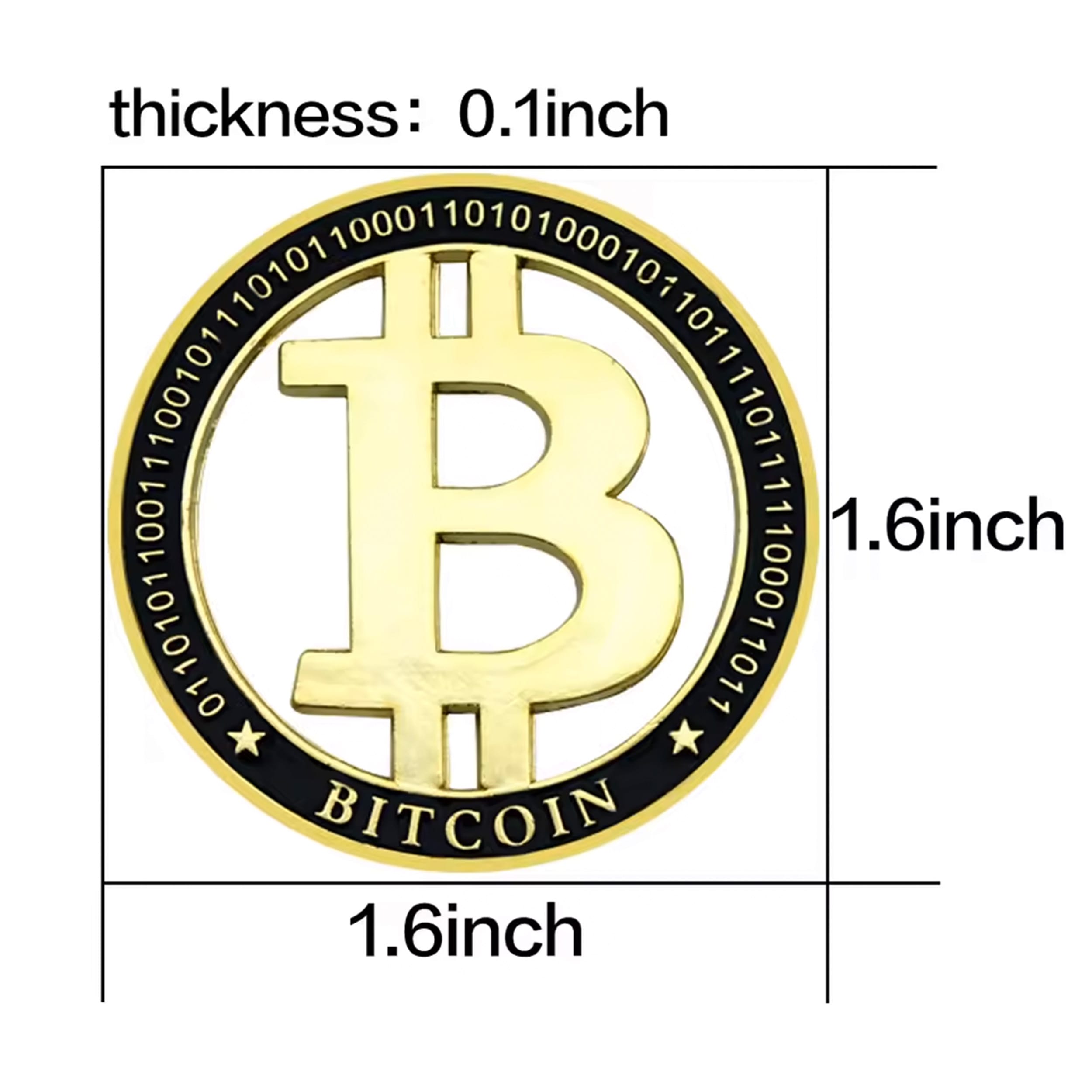 Unlike that disappearing act your portfolio pulled last year, I’m solid metal, gold-plated, and here to stay. My design? Oh, it’s fancy. I feature a clean-cut, 3D floating Bitcoin “₿” logo inside a sleek, black-bordered ring. Around my edge, you’ll see binary code because, obviously, I speak fluent computer. 🤖