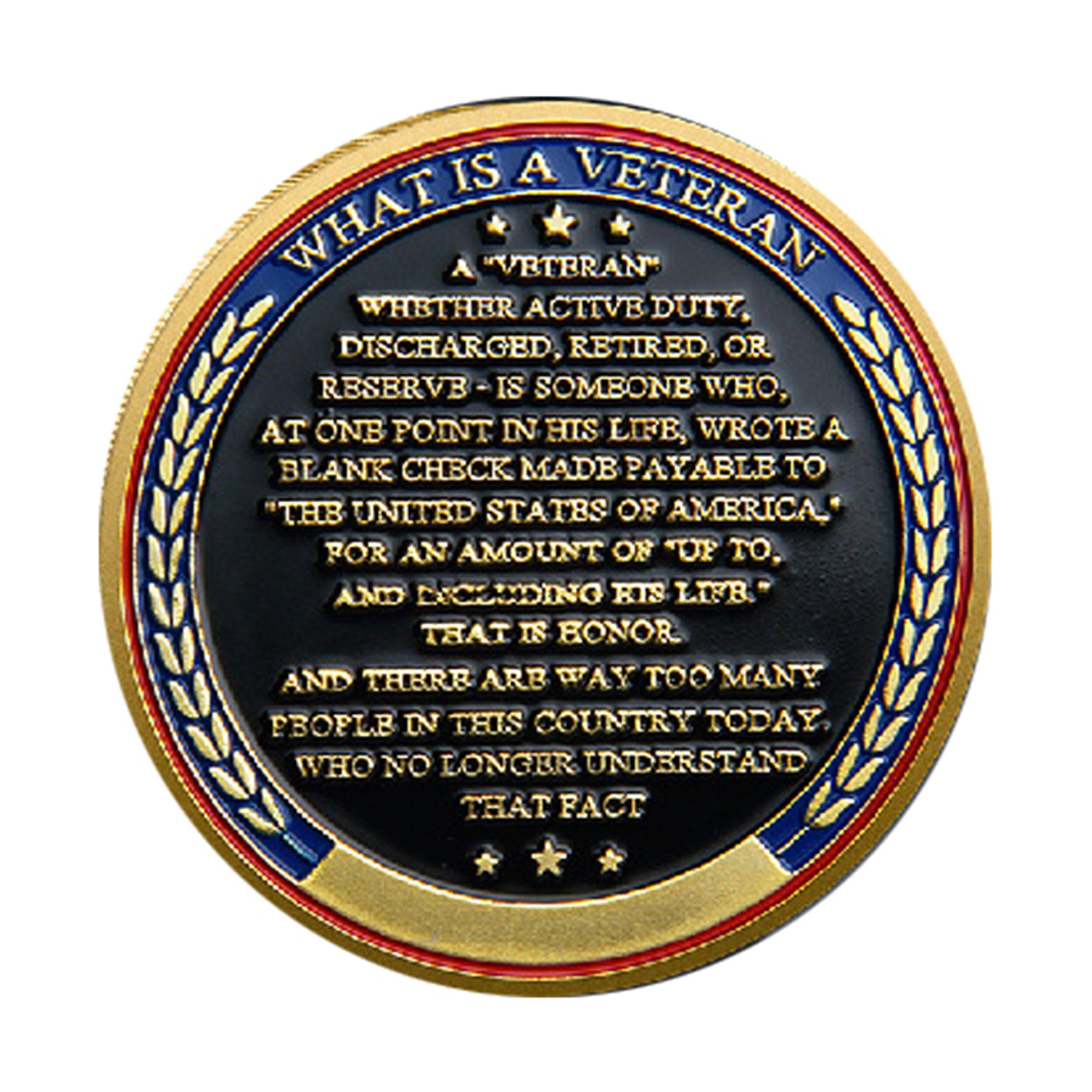 🎓 Reverse side features the full “What Is a Veteran” message in raised lettering