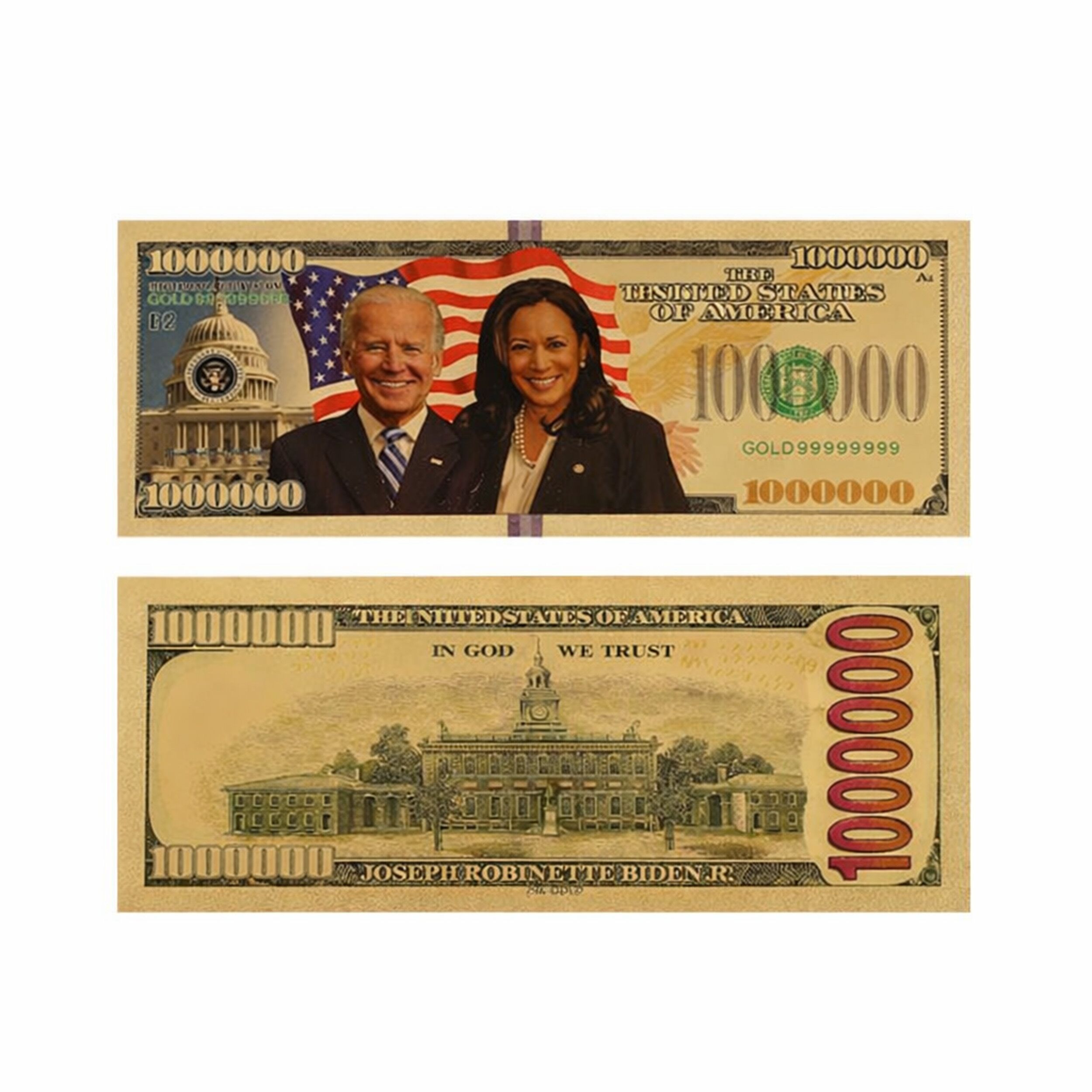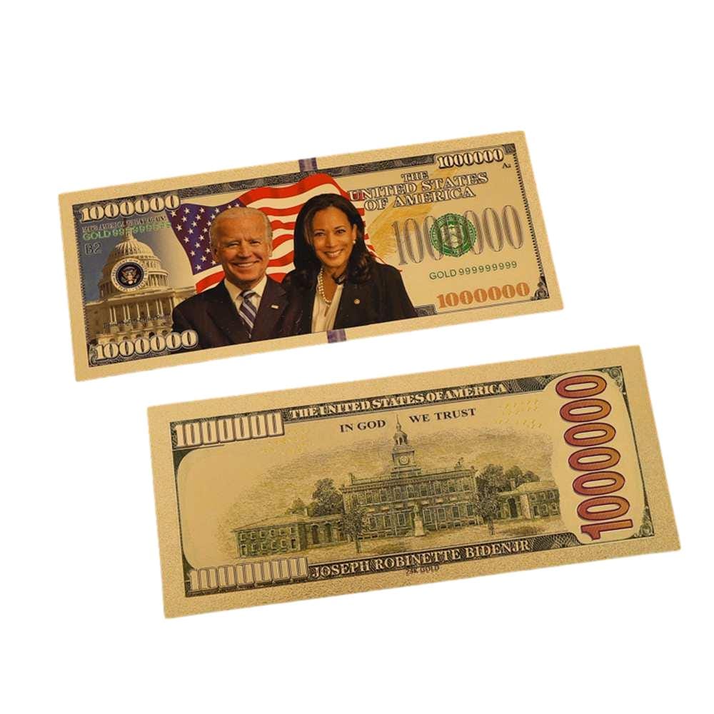 This extravagant 24k gold plated imitation bank note is a one of a kind commemorative item. Our Joe Bidden Kamala Harris Tandem 24k Gold Plated Bill Collectible Banknotes for Decoration is handcrafted with utmost care to each element which recreates the actual United States one billion dollar bill.