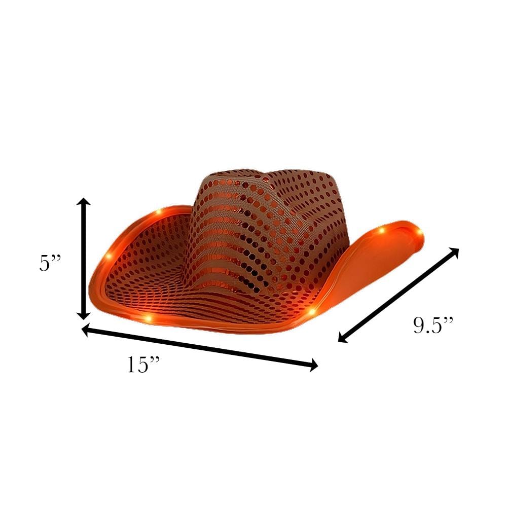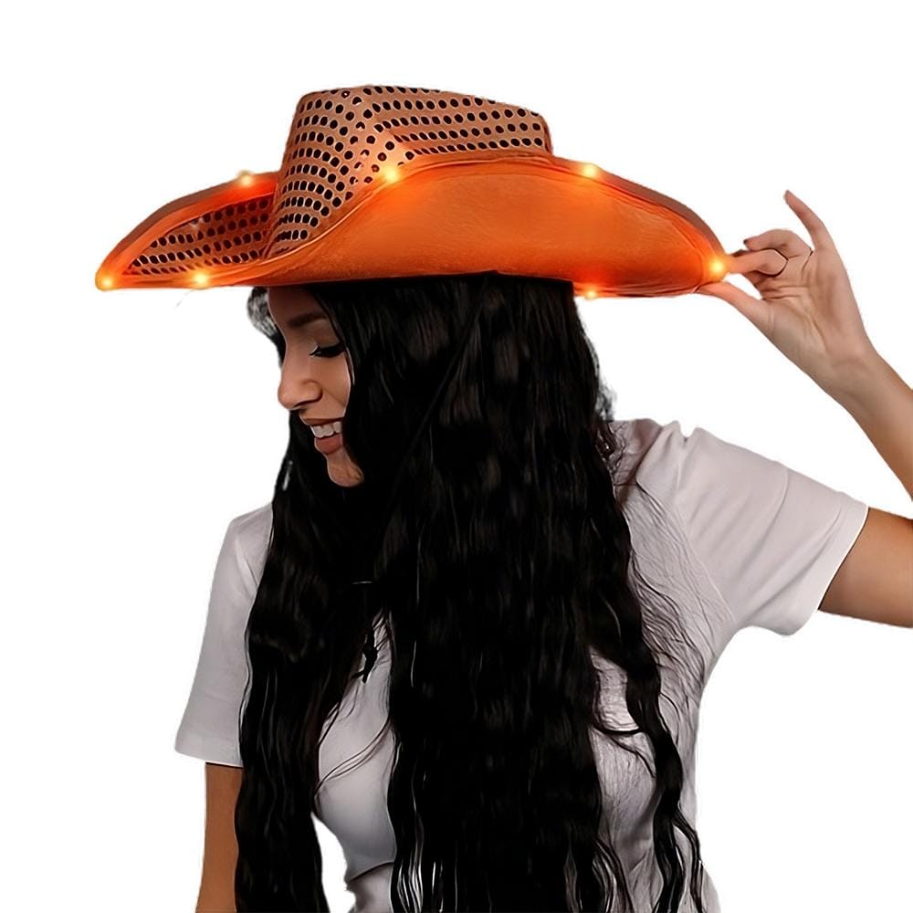YEEhaw, disco cowboys and gals! 🤠 I’m the LED Flashing Cowboy Hat with Orange Sequins, and I’m here to light up your life and the dance floor! With my vibrant orange sequins and flashy LED lights, I’m not just a hat; I’m the life of the party! 🎉