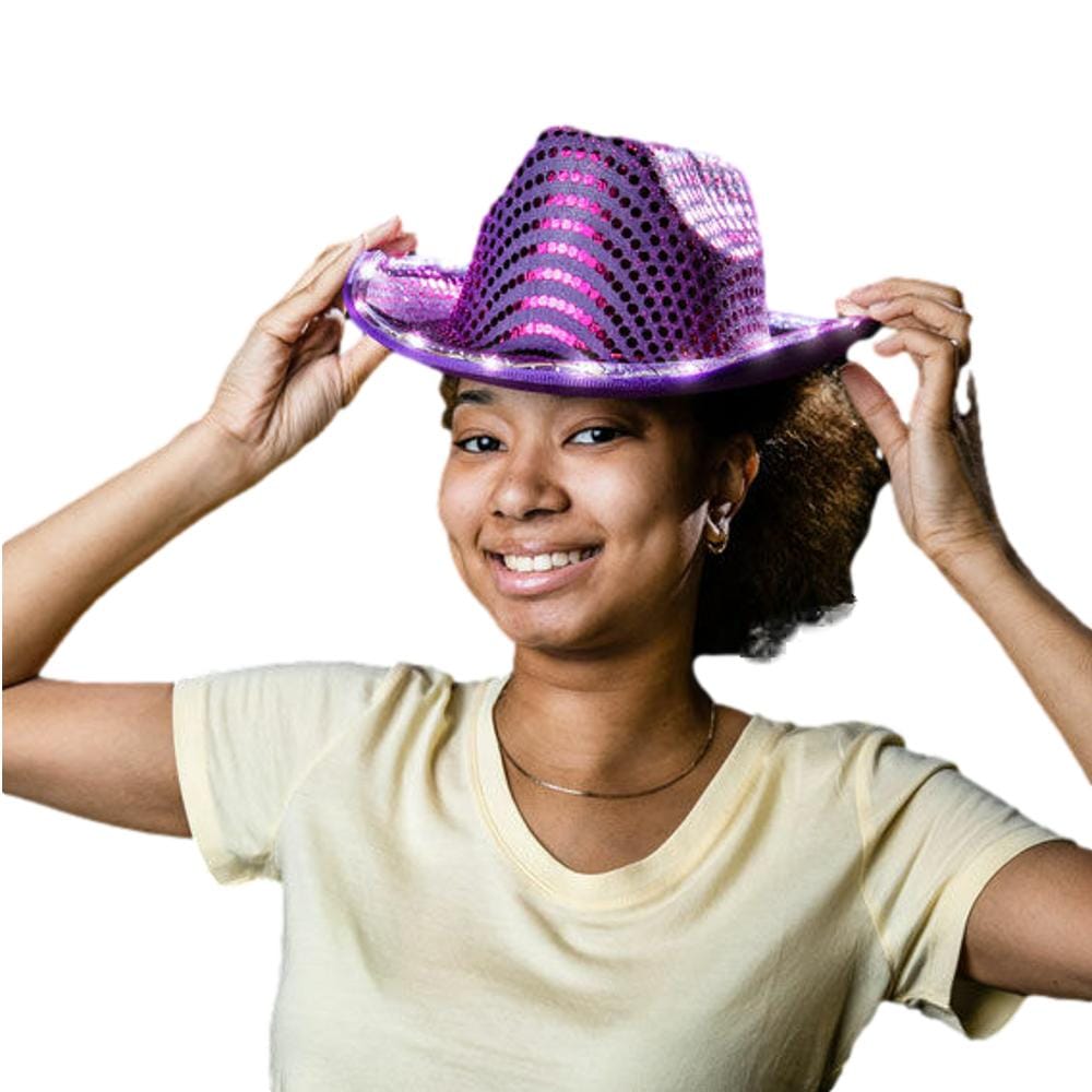 Well, howdy, partner! I’m the Halloween LED Flashing Cowboy Hat with Purple Sequins, and I’m here to add a spooky sparkle to your western style! With my bold purple sequins and eerie white LEDs, I’m the perfect blend of haunted glam and rodeo magic!