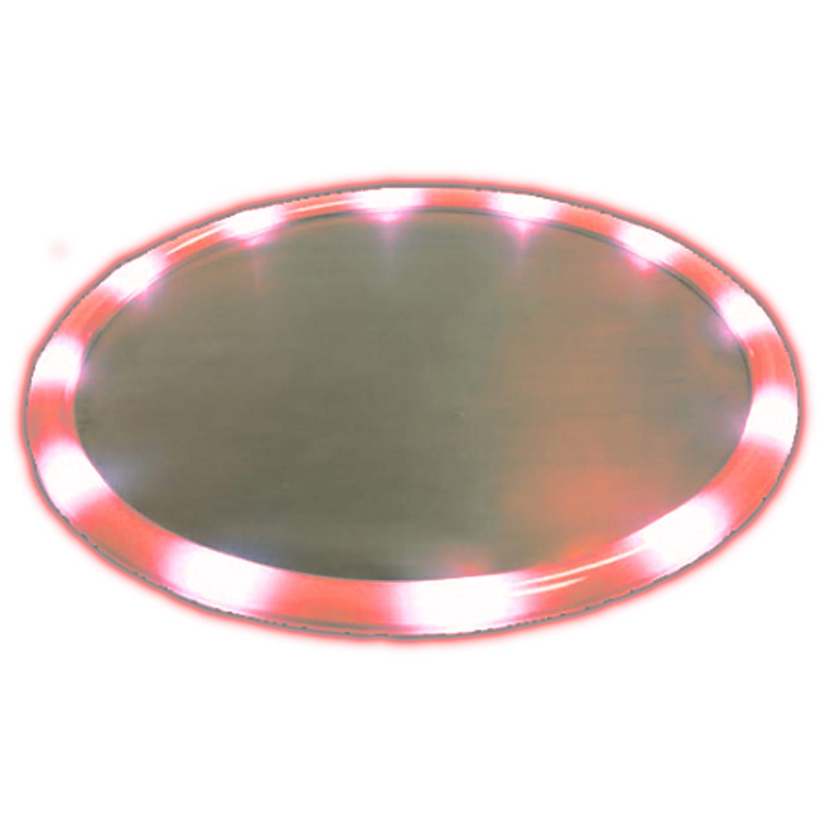 LED Serving Trays are lightweight & easy to carry. Tops of Serving Trays have a rubber liner to help prevent spillage. Trays feature a dazzling circle of bright lights around the outer rim. To activate your LED Serving Tray, slide the switch underneath, then press the black button near the battery pack. Bright LEDs will shine a steady light – no flash on this chilled out light product. Dimensions: Diameter: 14 in. LED Colors: Red Includes 3 replaceable AA Batteries. Packaging: Each piece in a plain white box – 1 piece per box.