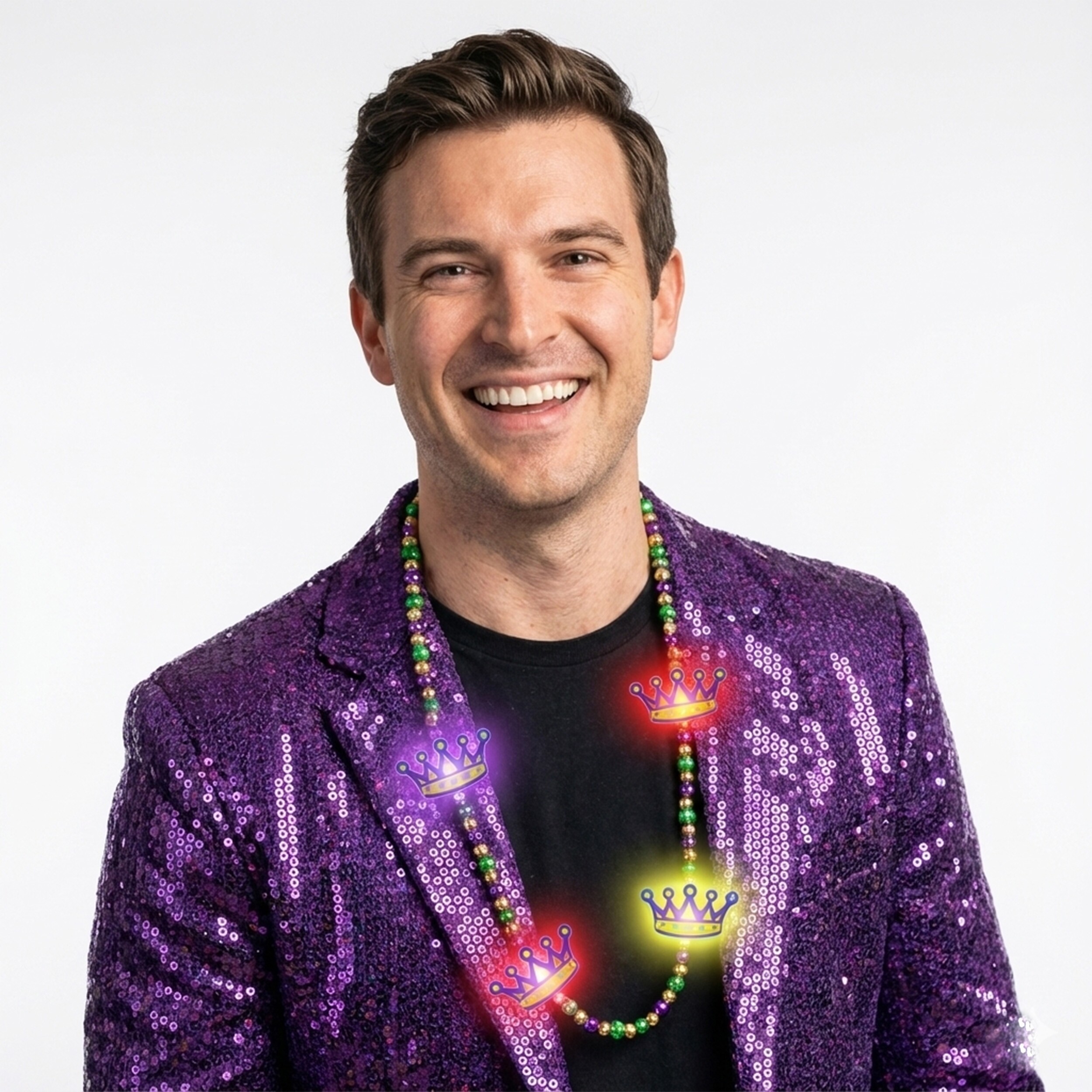 Yes, you. I’m the Light Up King Crown Beads Necklace, and I regret to inform you that once I’m around your neck, you are no longer just “attending” the party. You are ruling it. I arrive dressed in purple, green, and gold beads, because subtlety is for weekdays, and Mardi Gras does not recognize weekdays. I come prepared with glowing crown charms because plain beads are nice, but glowing royalty is better. 👑