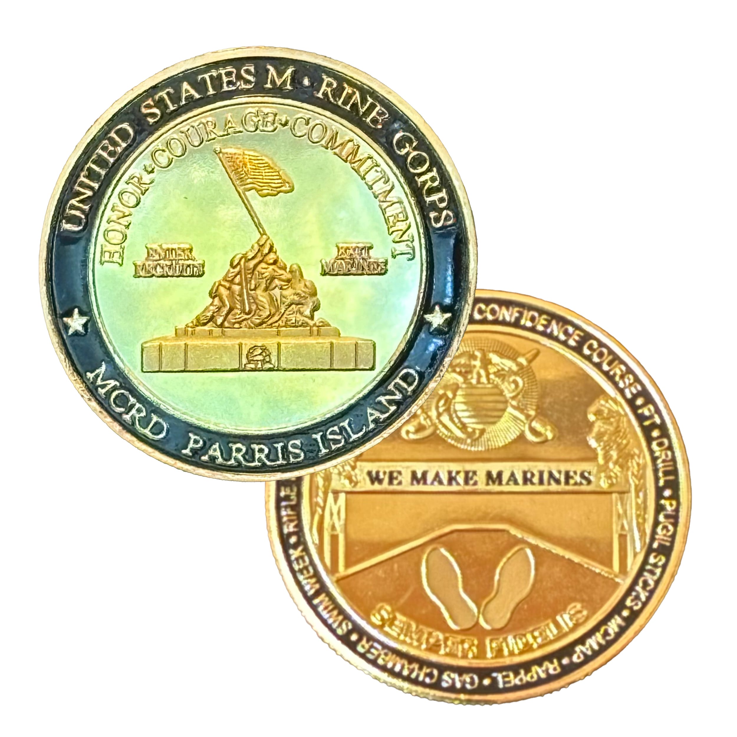 On one side, I’m rocking the iconic Marine emblem with pride. That eagle, globe, and anchor aren’t just for show; they represent the blood, sweat, and tears that go into making a United States Marine. I’ve got the famous footprints etched in gold too, reminding every recruit of the first steps they took on that legendary yellow path. “Semper Fi,” I shout with every glint of my gold finish. Talk about being dedicated!