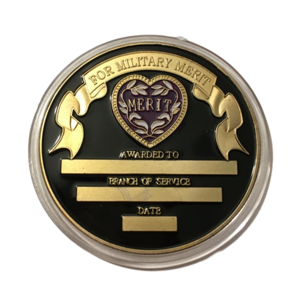 Hey there! I’m the Purple Heart Military Merit Division Challenge Coin, and let me tell you, I’m not just your average coin. I’m a solid 1.57 inches of pure awesomeness, plated in gold, black, and a splash of purple. You could say I’m like the superhero of coins — if superheroes had a shiny finish and a reeded edge! 😎✨