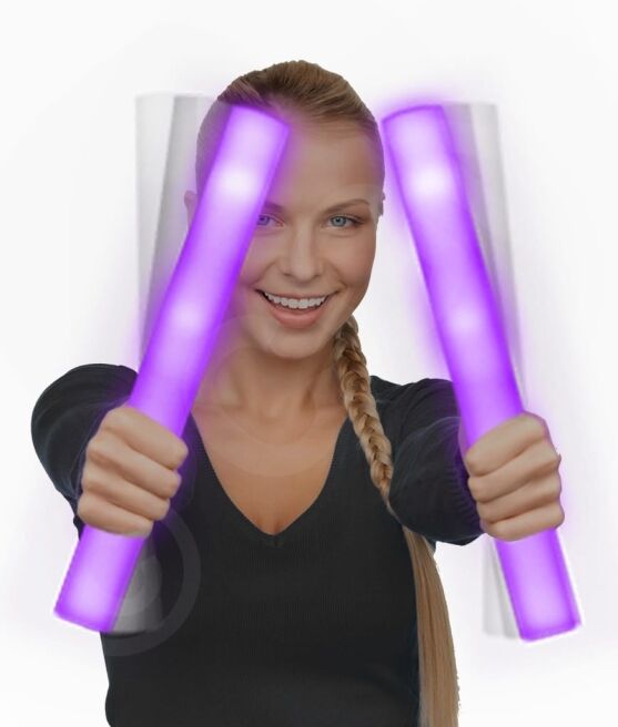 Purple LED Foam Cheer Sticks include 3 replaceable AG13 Batteries.