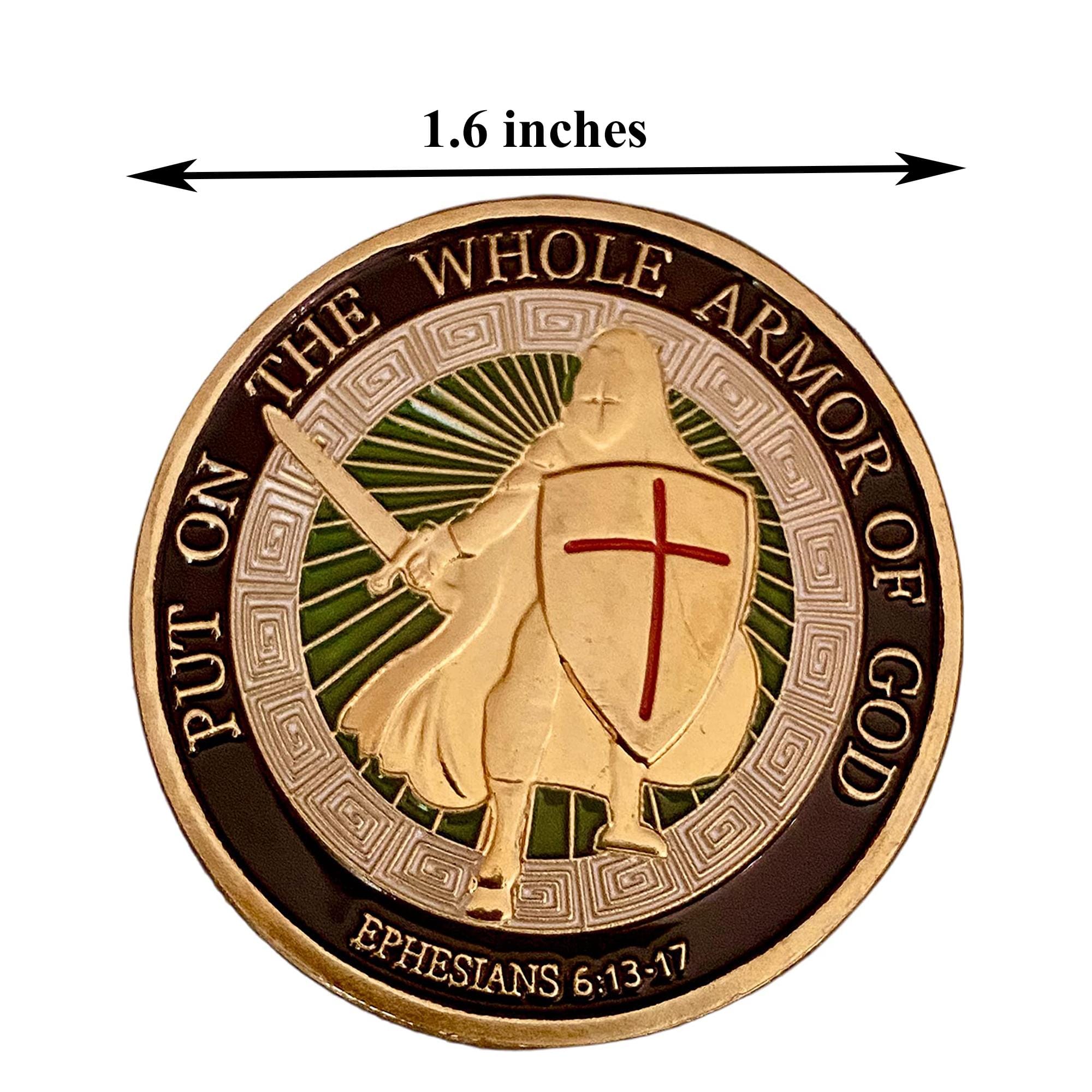 The Put on the Whole Armor of God Christian Gold Plated Coin is a beautifully crafted keepsake inspired by the biblical call to spiritual readiness found in Ephesians 6. Measuring 1.57 inches wide and just 0.12 inches thick, it features a vibrant hard enamel finish in gold, brown, green, blue, white, and red, making it a striking piece for any religious coin collection. Each coin arrives in a protective matte case that keeps the shiny gold plating looking its best for years to come. Whether you carry it daily as a personal reminder of faith or give it as a thoughtful Christian gift, this coin delivers lasting meaning in a compact, collectible form.