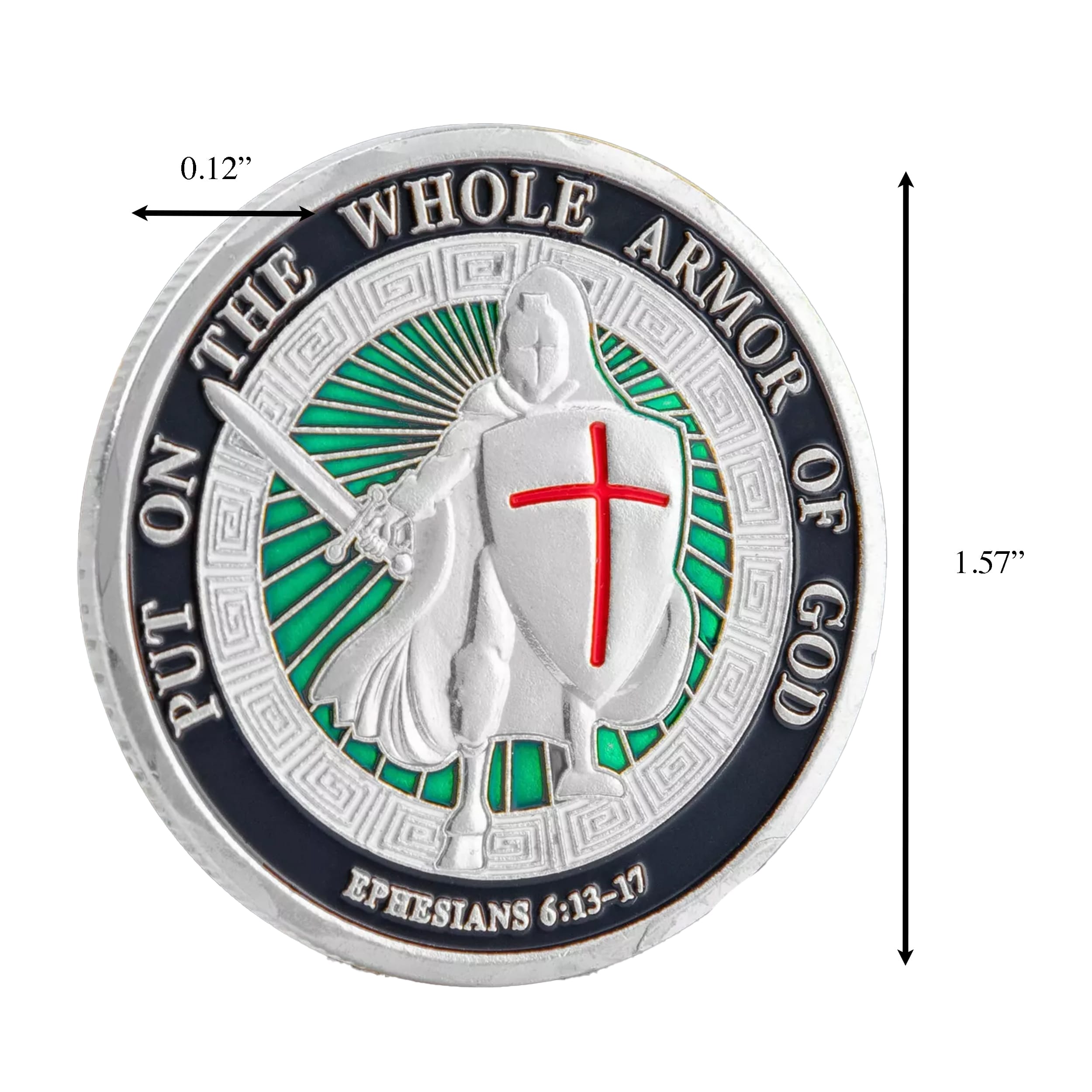 Hey there! I’m the “Put on the Whole Armor of God” coin, and let me tell you, I’m not just a shiny trinket. Measuring 1.57 inches across and only 0.12 inches thick, I’m the ideal pocket companion. You can take me anywhere, and I promise I won’t weigh you down—no heavy lifting here! 💪