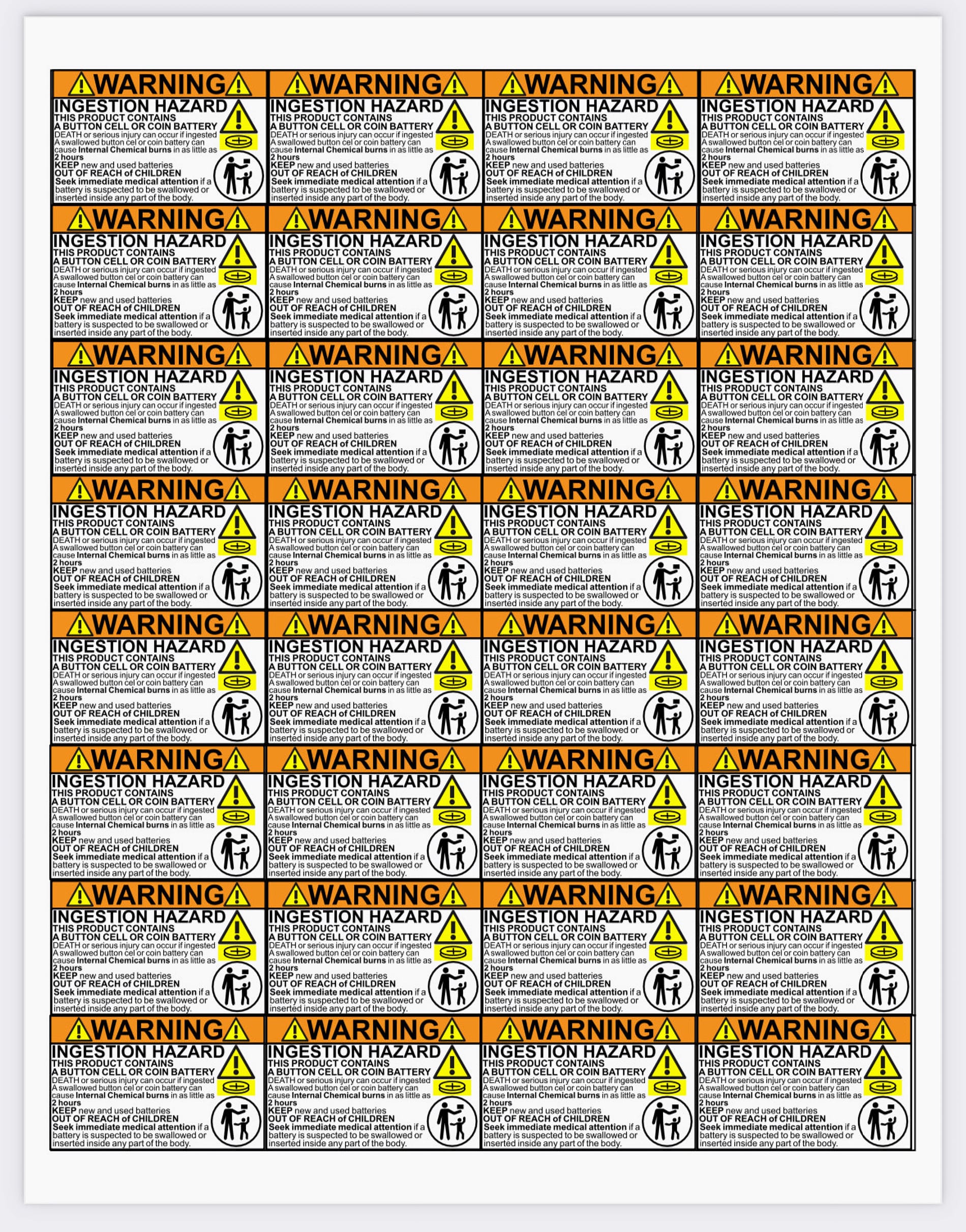 Let me tell you a little about myself. I come in a handy-dandy sheet of 32, perfect for all your button cell battery-containing products. Each sheet measures 8.5″ x 11″ and fits snugly in your safety toolkit. I’m 2″ x 1.25″ of pure warning power, printed on standard white matte for that crisp, professional look. 📏✂️