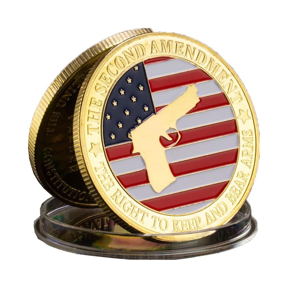 On my face, you’ll find the star-spangled banner – that’s the ol’ Red, White, and Blue for the uninitiated – and a gold gun that’s embossed like it’s jumpin’ right out at ya. That’s to remind you of the Second Amendment, and let me tell you, it’s not just a right, it’s the right to bear these guns 💪🔫 (well, not literally, ’cause I’m non-operational… and also a coin).