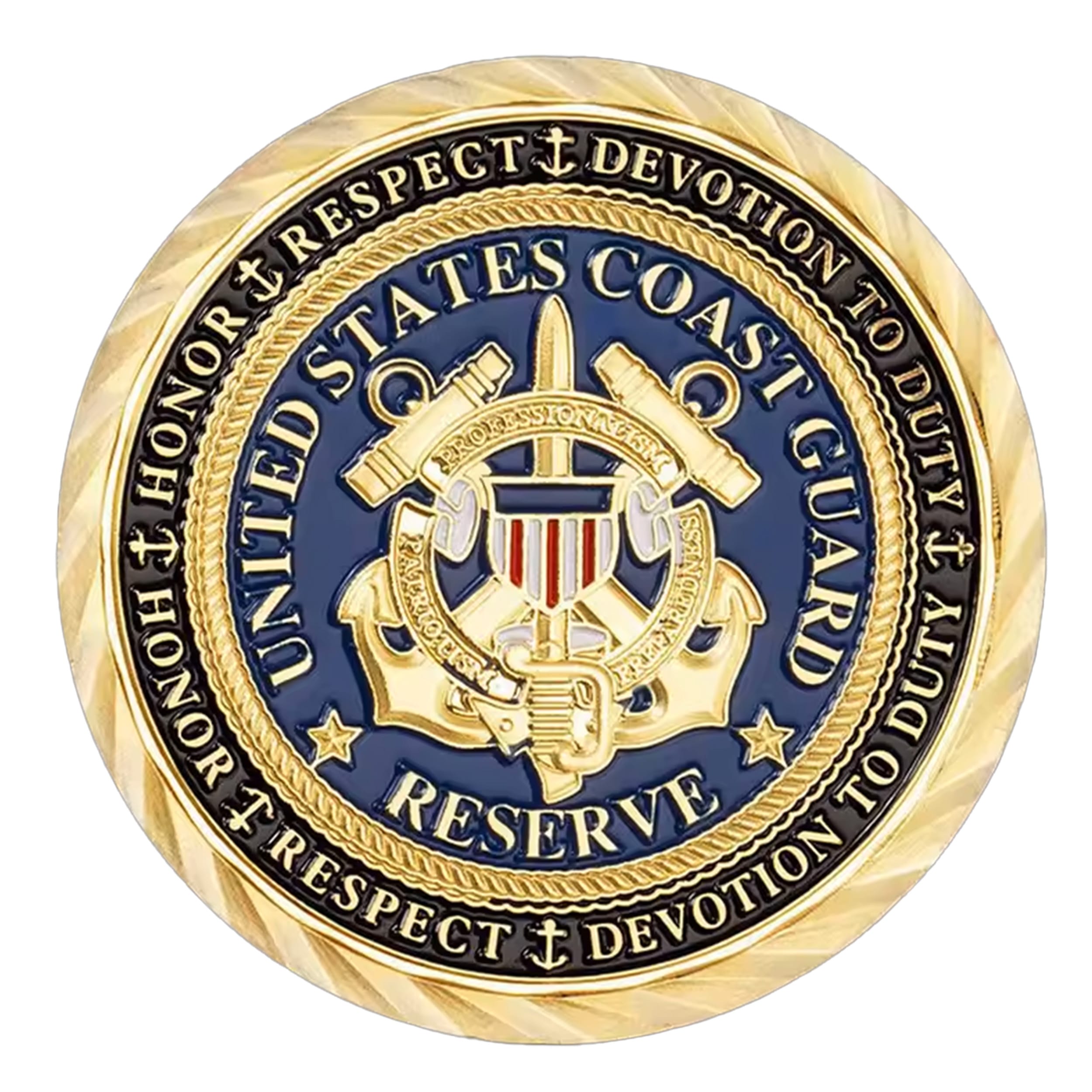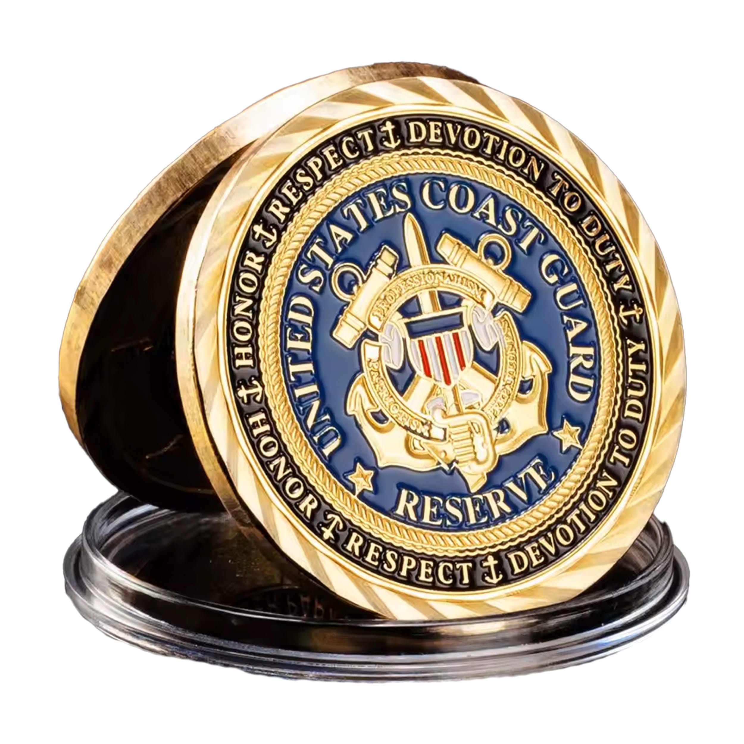 Let’s talk about my front side – or as I like to call it, my “official credentials.” Stamped proudly in gold and navy blue, I bear the legendary insignia of the United States Coast Guard Reserve. Look closely and you’ll see the anchors, the shield, and that bold statement of commitment: Honor, Respect, Devotion to Duty. Yep, I don’t just sit around—I live by the code. ⚓💪
