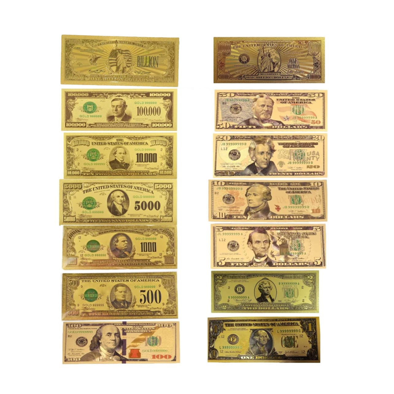 These Commemorative Mega Billion 24K Gold Plated US Dollar Fake Banknotes Set of 14 Timeless Collection will make you value your real spendable cash even more. This fake commemorative set features fun fake versions of the most valuable pieces in US history — historical and modern. This is a set of fake bills that have been coated with real 24K gold, to give you the experience of owning real money without the risk.