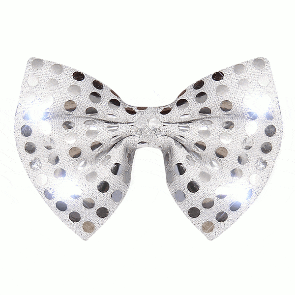 To activate your LED Silver Sequin Bow Tie, find the sticker on the back of bow tie. Push there for multiple options: flash, blink, or a calm steady light. Dimensions: Bow Height 3.75 in. Bow Width 5 in. LED Colors: 6 White Sequin Silver Bow Tie with White LEDs include nonreplaceable batteries.
