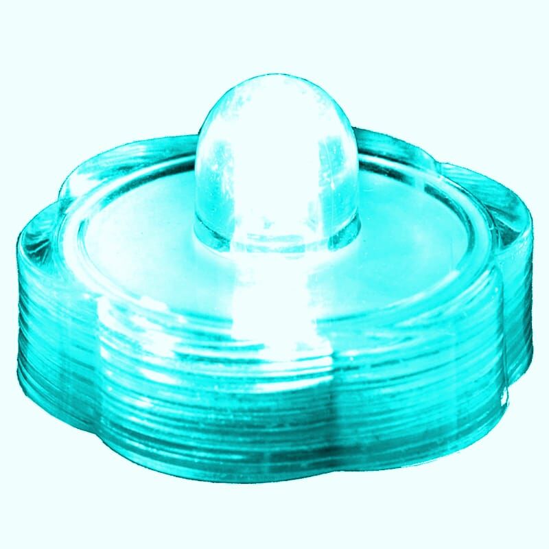 To activate your Submersible LED Lights, twist the top clockwise. Screw on tightly to ensure safety. To shut off, twist the top counterclockwise. These waterproof lights do not flash or blink. Dimensions: Height: 1.00 in. Length: 1.25 in. LED Color: Turquoise Include 2 replaceable CR2032 Batteries.