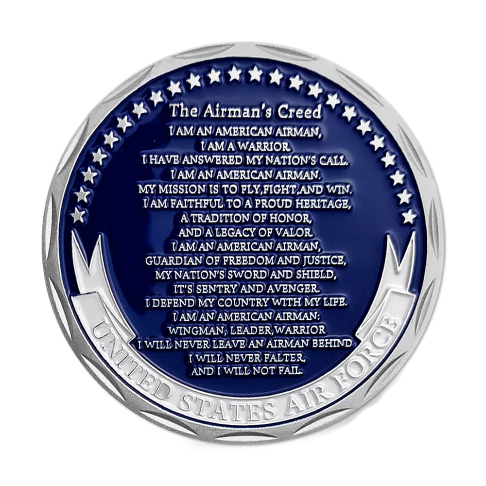 Flip me over, and you’ll find the legendary Airman’s Creed, engraved with precision and style. 📜 It’s all there in glorious silver and blue, reminding everyone that “I am an American Airman, I am a Warrior…” and the rest of that epic speech that gives you goosebumps every time. I mean, who wouldn’t want to carry around such a cool piece of inspiration? 🛩️✨