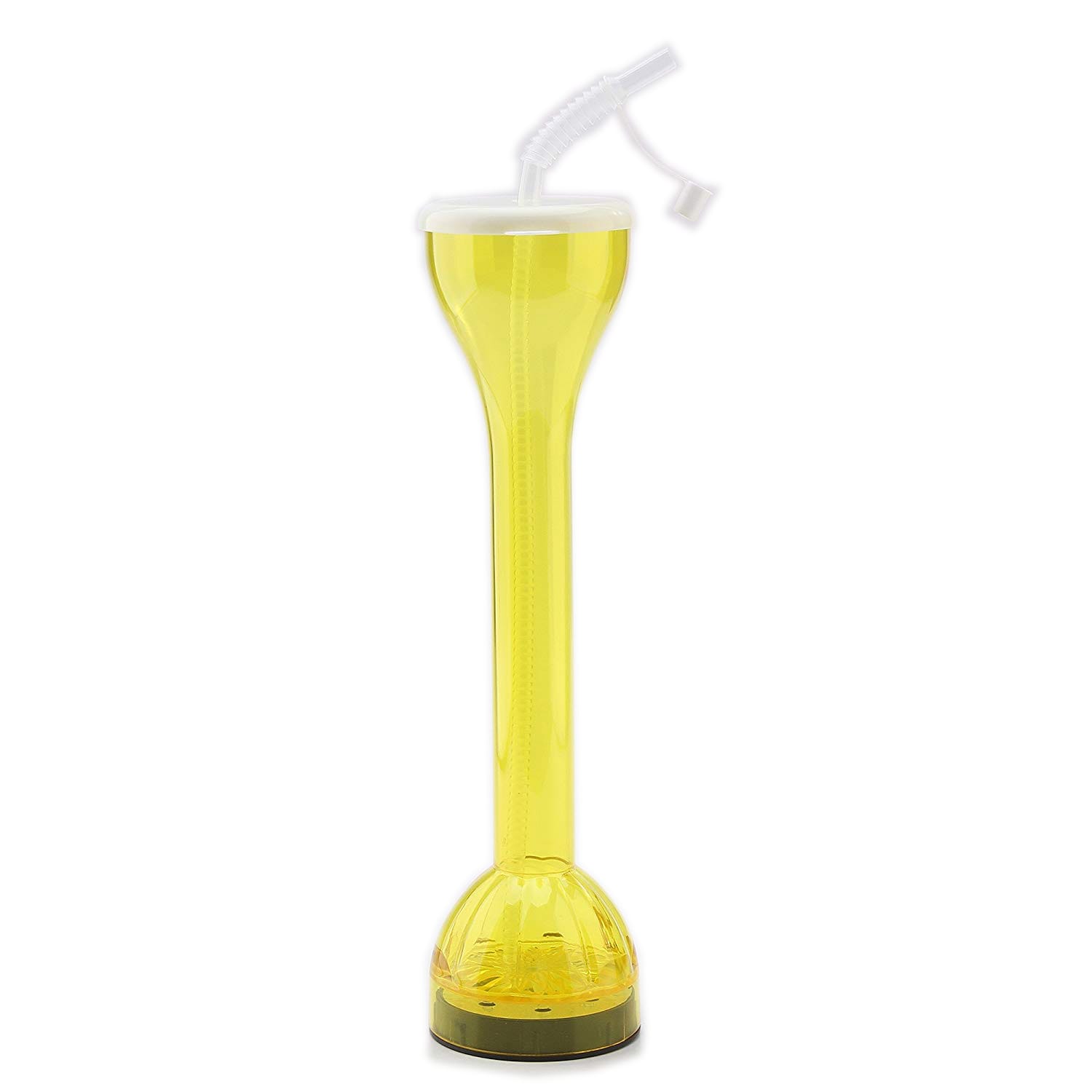 To activate your Yard Drinking Glass, slide the switch on the bottom of your party cup. LED Yard Glasses have a battery saving feature: when you set it down on a table, the lights will stop flashing. To activate again, just pick up your Yard Glass! Once finished for the night, flip the switch again & the LEDs will stay off. Dimensions: Height: 13.0 in. Volume: 17 oz filled to brim LED Colors: Multicolor 17oz Yard Drinking Glasses include 4 replaceable AG13 Batteries.