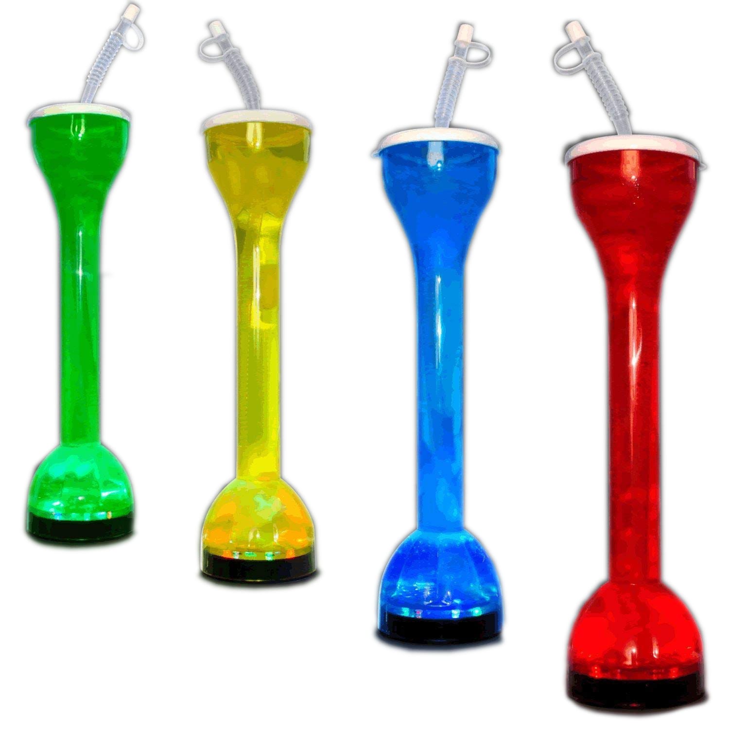 For our Flashing Yard Glasses you’ll have high regard. They hold 17 ounces, but they’re not really a yard. They’re made of good plastic that is always food grade. They come in assorted packs of Red, Blue, Yellow and Jade. To activate the Flashing 17oz Yard Glass simply slide the switch on the bottom of the base to ON. This product has a battery saving feature; when you set the item down on a flat surface the flashing LEDs stop. To activate the LEDs while the switch is ON just lift the glass from the flat surface. NOTE: Each Light Up Yard Glass comes with a straw and straw cap. If you enter a 1 in the quantity box then you are buying one single glass so whatever number you enter is exactly how many individual glasses you’ll recieve. Height: 13.0 in. , 33.02 cm. – Volume:17 oz filled to brim – LED Colors: Red Yard Drink: 4 Red, 2 Purple – Blue Yard Drink: 2 Red, 2 Jade, 2 Blue – Jade Yard Drink: 4 Jade, 2 Red – Yellow Yard Drink: 4 Jade, 2 Red – 3 replaceable AG13 Batteries included and installed.