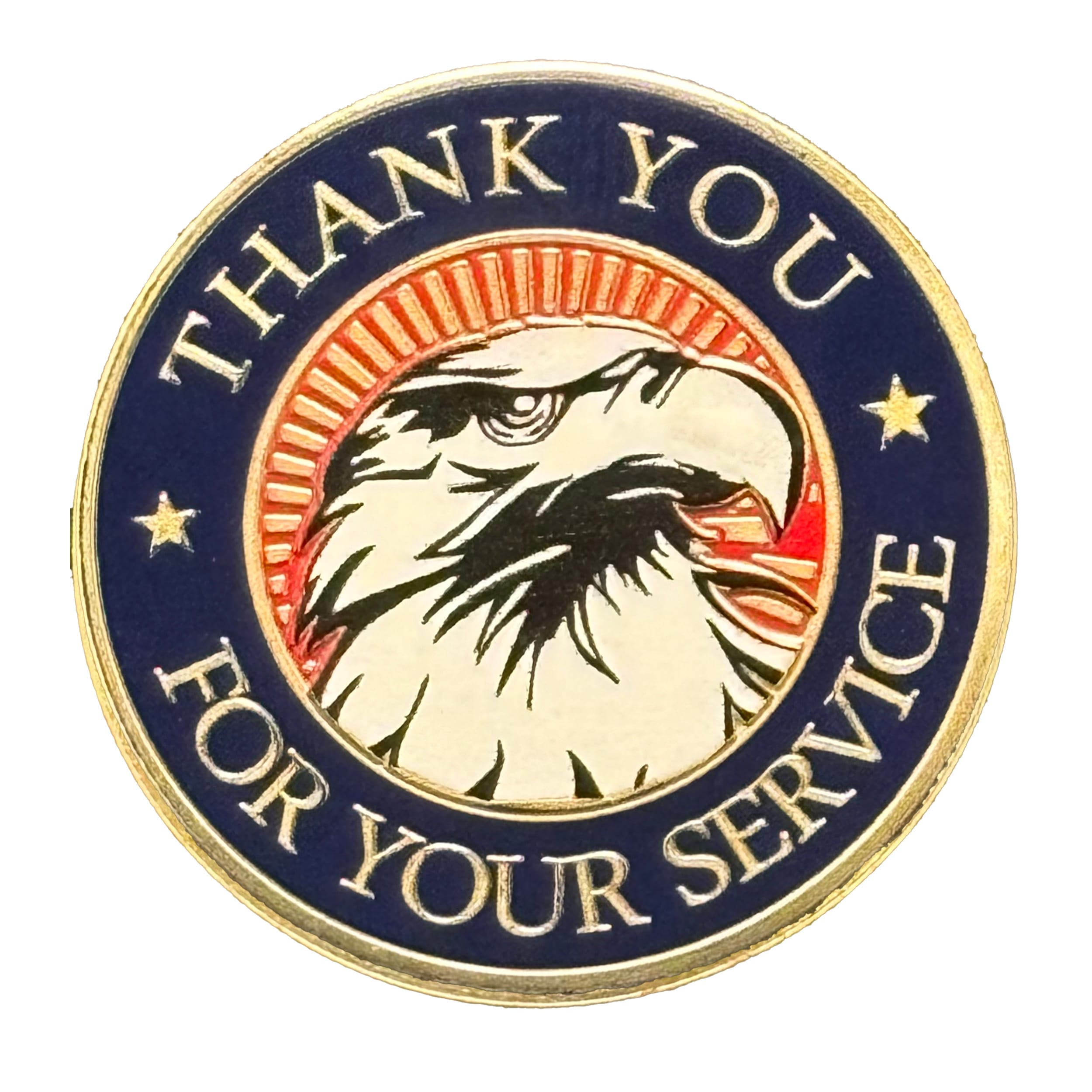 Now, flip me over and BAM! Say hello to the most majestic eagle you’ve ever seen. Staring you down with that fierce look, I’m like, “Yeah, freedom’s here, and I brought backup!” The bold text “Thank You For Your Service” surrounds me, just in case anyone forgot the message of pure gratitude I carry. Honestly, I’m pretty much a walking (well, flipping) symbol of American pride. ️